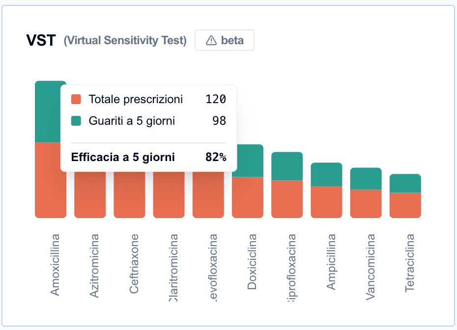 Un'analisi avanzata che ti permette di scegliere l'antibiotico più efficace: visualizza i tassi di successo dei primi 5 antibiotici, basata su casi simili al paziente attuale.
